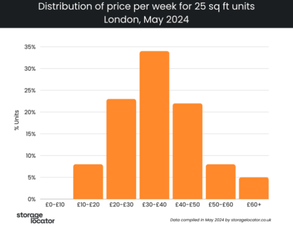 There is a wide range of prices for self-storage in London. Prices vary by location and by availability of specific units, among other reasons. In May 2024 only 8% of sites offered 25 square foot units for less than £20 per week, and we found no 25 square foot units in London for less than £10 per week. At the higher end, 5% of self-storage sites in London advertised prices above £60 per week for a self-storage unit.