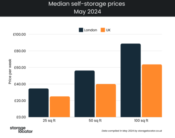 The median price for a 25 square foot self-storage unit in London was £34.62/week in our latest analysis of pricing in May 2024, which is 38% more expensive than the national median. You will also generally pay more for a larger unit in London than elsewhere in the UK. In our sample, the median 50 square foot self-storage unit in London was £56.31 per week, or 41% more expensive than the UK median price for self-storage. The median 100 square foot self-storage unit in London cost £88.85 per week (39% higher than the UK median).