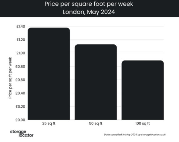 Large self-storage units usually have a lower price per square foot than smaller self-storage units. Looking at median prices in May 2024 from our sample, we found that 50 square foot units in London were 19% cheaper than 25 square foot units on a price per square foot basis. 100 square foot units were cheaper still, with the median price per square foot 36% lower than 25 square foot unit prices. In other words, the more you store, the more you save.