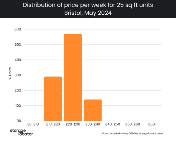 There is a wide range of prices for self-storage in Bristol. Prices vary by location, by availability of specific unit sizes, by opening hours, among other reasons. In May 2024 about 86% of sites offered 25 square foot units for less than £30 per week. We did not find any units in Bristol for less than £10 per week. Even the most expensive 25 square foot units were still less than £40 per week.